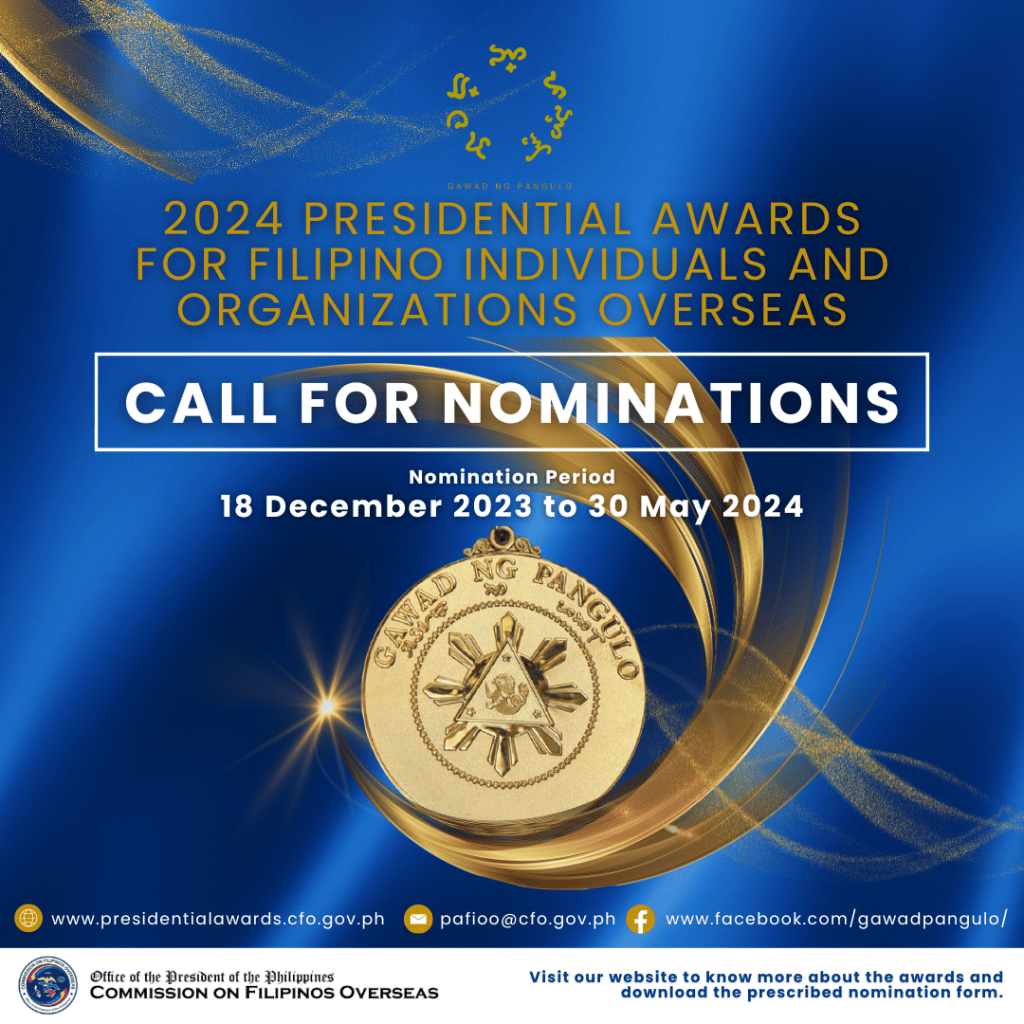 CALL FOR NOMINATIONS FOR THE 2024 PRESIDENTIAL AWARDS FOR FILIPINO INDIVIDUALS AND ORGANIZATIONS OVERSEAS